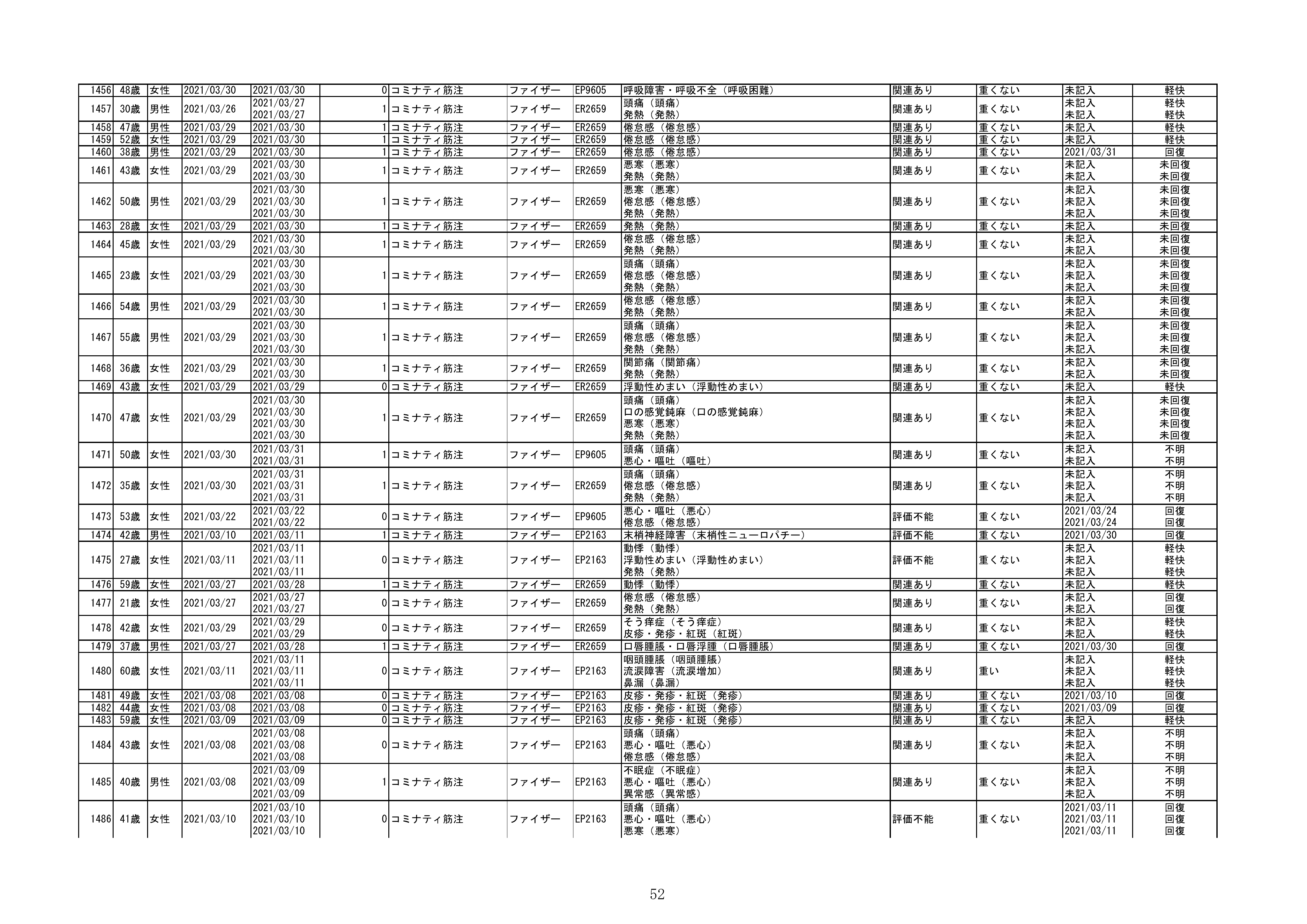 資料1-1-2-1 予防接種法に基づく医療機関からの副反応疑い報告状況について(コミナティ筋注・報告症例一覧)